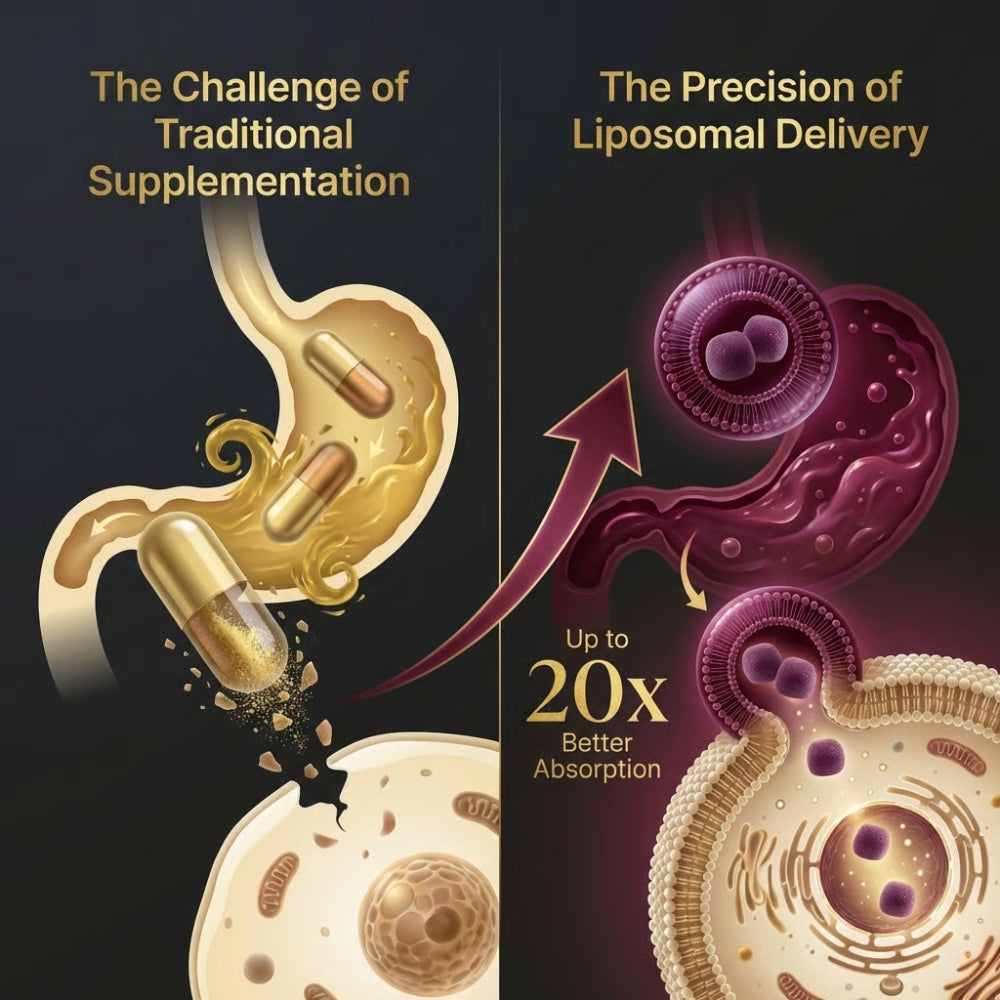 Liposomal technology wraps the active ingredient (Nicotinamide Riboside) in a protective fat bubble (a liposome). This shields it from being destroyed by your stomach acid, allowing for vastly superior absorption directly into your bloodstream and cells—up to 20x more effective.